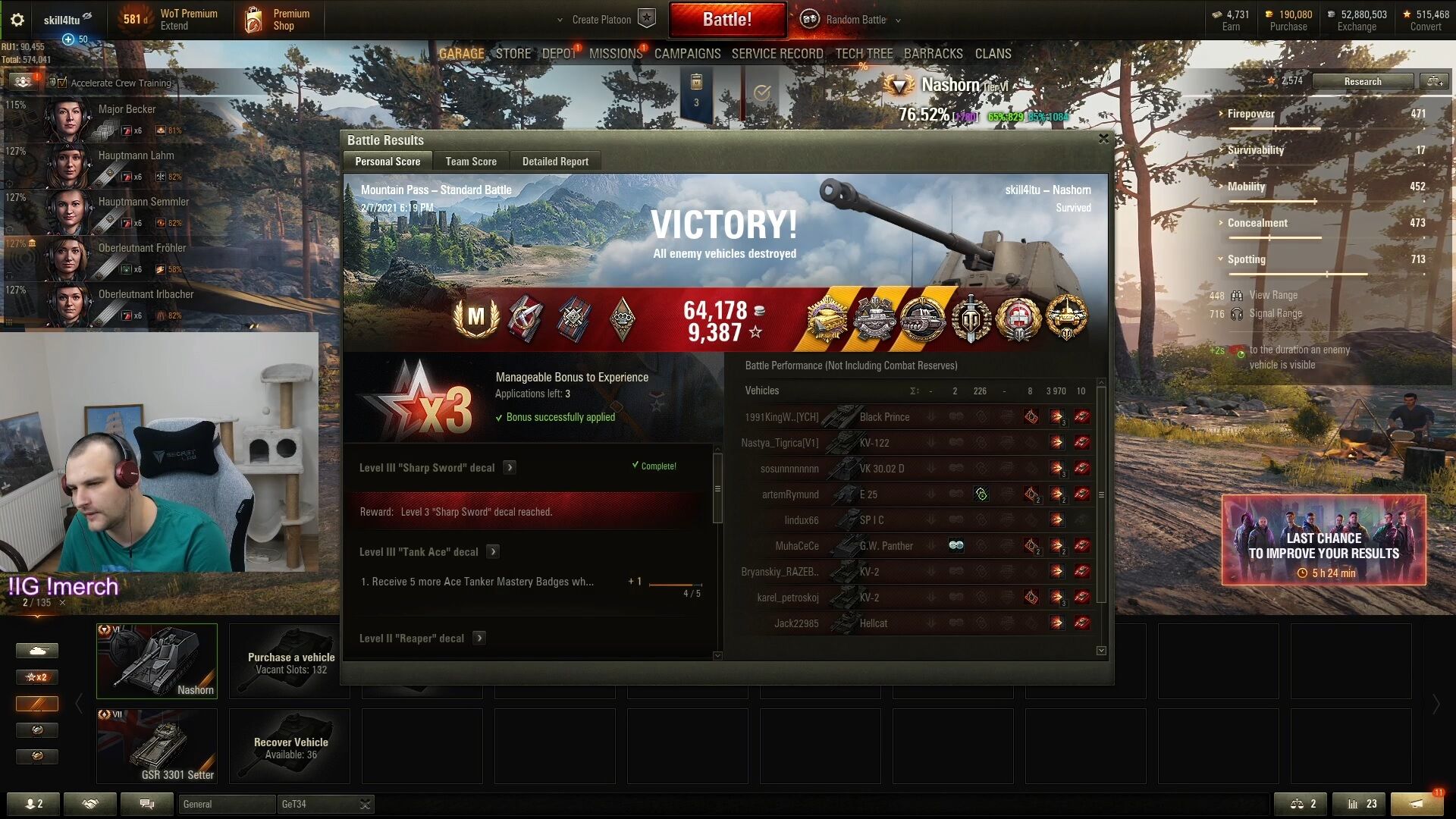 Bár a stun kevesebb, de a sebzésem majdnem kétszer annyi, mint neked. És két tankot is kb. 10 méterről direktben lőttem ki. És neked amúgy killed se volt, ami eléggé számít azért. Elég őrült egy csata volt amúgy. És a vicces (ahogy korábban is írtam), hogy ez még mindig nem lenne elég az obj260 15-ös küldetéshez. Szóval bocs, de szerintem egy t10-es arty-val nem volt egy különösen jó kör a tiéd.