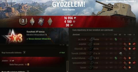 És két óra szívás után, egy nagyon élvezetes csata volt, és csak azért tudtuk lehozni, mert a Charfuture-ral tök jól összedolgoztunk (+ egy batchat AP, aki a végére elhullott). Úgyhogy ha valaki ismeri innen zokni1111 nevű játékost, akkor üzenem, hogy szép játék volt, nagyon élveztem. Csak sajnos szokás szerint chatban-en vagyok, nem tudtam válaszolni neki. Amúgy néha jó, ha alacsonyabb tierben van az ember: az obj705a végig nem vett komolyan, többször is tudtam lőni az oldalát, miközben a nagyobbakat hajkurászta, pedig akár engem is lőhetett volna. És azért az fájdalmas lett volna.