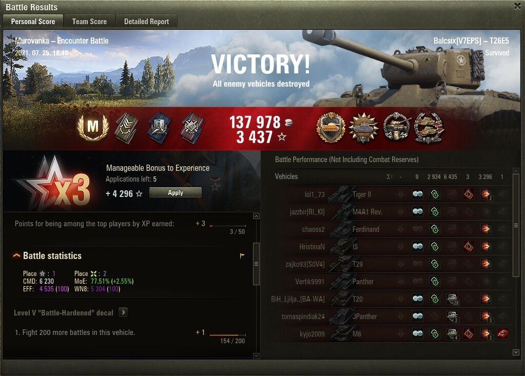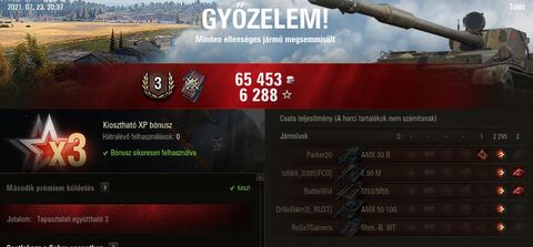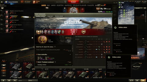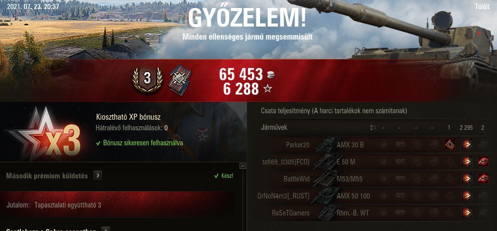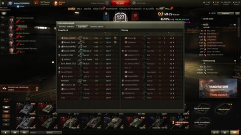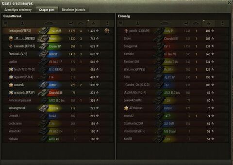 . Nagyon jó volt a mi csapatunk is, és az enemy is. T8-10-es csata volt. A hegyet jobbról áttoltuk, de nem tudtak a fiuk a védelemtől továbbmenni, az enemy a víz felöli részt tolta át, de ők meg tőlünk nem tudtak betörni. A végjátékban a mi oldalunkon maradt egy T30, T10, egy arty, én a SU-130-al, egy 103. A másik oldalon egy CS 53, két AMX nehéz (30B és 50-100) egy arty, egy E50 M és egy Rhm B. 6 másodperccel a vége előtt lőttük ki az utolsó enemy-t.