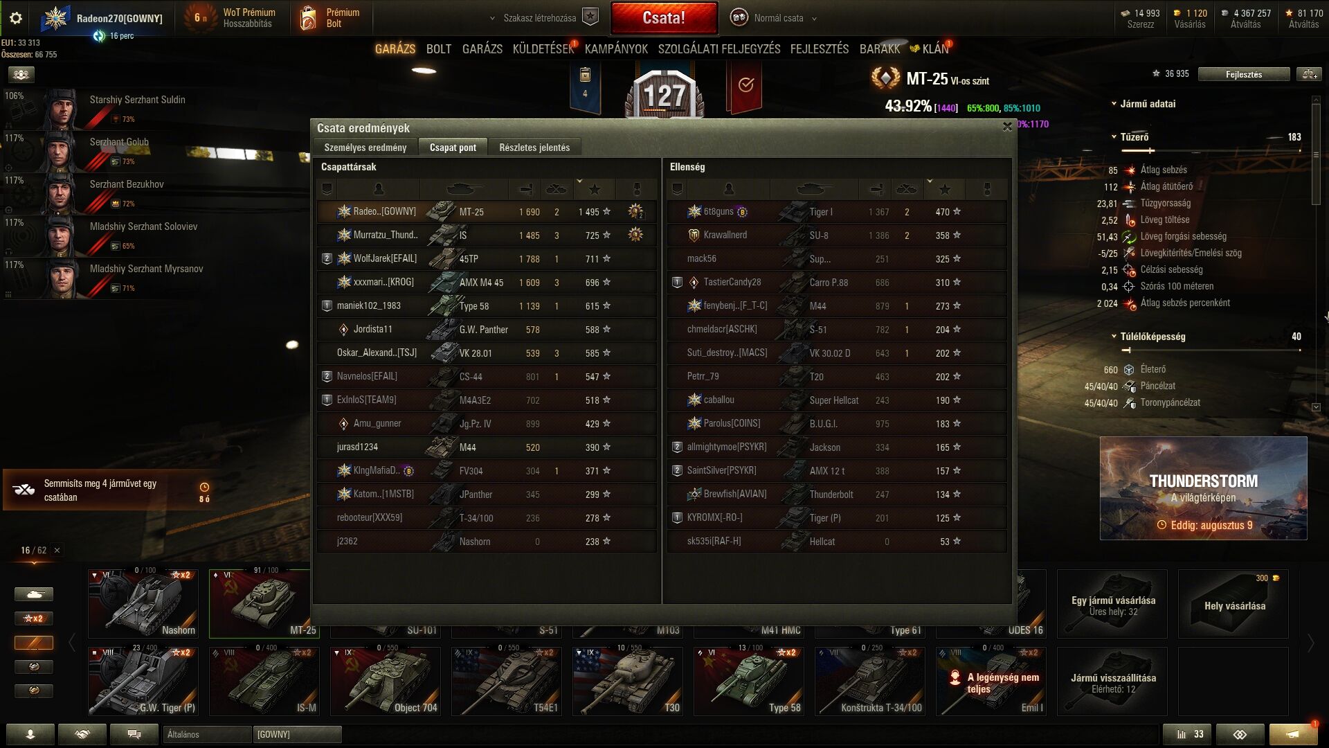 Ez a csodabogár (3 másikkal együtt) úgy nem tudott leszámolni az ellenfél Mausával, hogy a T95 ott állt pajzsként a Maus előtt, ennek az egysejtűnek meg csak mellé kellett volna mennie. A Mausnak 500 hp-ja volt, barátunknak meg még 1k felett. Lehet itt is kéne valami ranked féle rendszer, hogy bukni is tudjon az illető. És ha nem ér el egy szintet, akkor zárolva lesz addig a t10-es tankja, amíg nem teljesít jobban. Mondjuk persze hiányoznának a másik oldalról, nem lenne ingyen frag.