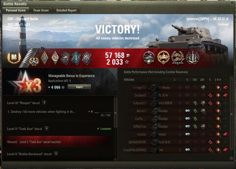 A VK 30.01 H-t próbálom lemarkolni, viszonylag alacsonyan van a kívánt érték, még nekem is, olyan, 5-6 lövés körül van általában (1200-1300 között mozog jelenleg), ezért sikerül elérni olyan könnyen, de növelni nem nagyon tudom, vagyis így, egy-két tizeddel, csak ezzel az a baj, hogy ha meg beesik egy rosszabb kör, ott meg bukok 0,5 vagy akár több százalékot...