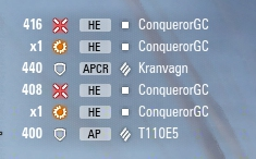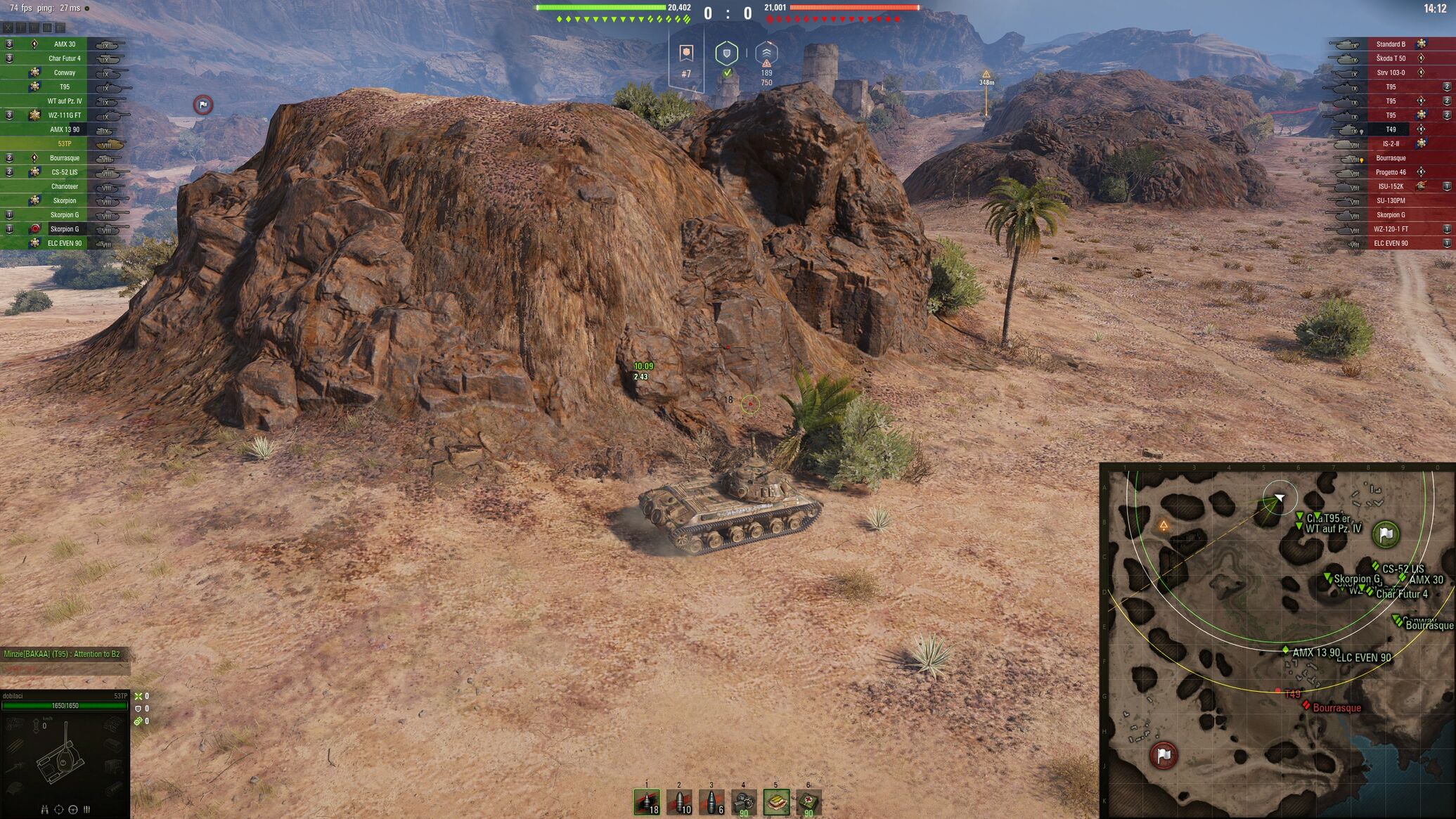 Nekem tegnap volt egy olyan meccsem kpz50t-vel, hogy azt hittem az agyam eldobom. Mountain Pass volt a pálya, és az elején kb semmit nem tudtam csinálni, mert az égvilágon nem találtam el semmit. Az ellenfél már kb. 3 oldalról támadta a bázist, én meg top tierként egy op tankban 0 sebzéssel álltam. De aztán jól helyezkedtem a bázis mellé, a dombbal szemben abba kis árokba a piros vonal mellé. Na, innen aztán indult a farmolás, és annak ellenére, hogy ennek a tanknak a töltésideje elég jó, alig vártam hogy újra betöltsön, hogy lőhessek. Végül ketten maradtunk ott egy t-10-zel meg még két másik tank (egy tőlünk, egy az ellentől) valahol a térkép másik szélén. Szóval ott aztán kaptam a t-10-től mindent: trackelt, ammorackelt, mindezt három sebző lövéstől, mert ugye elég csak rátenyerelni a kettes gombra, és akkor nem nagy cucc átlőni már a tornyát se. A vége az lett, hogy maradt valami 50 hp-m és az ammorack ellenére kb. egy mp-cel korábban töltöttem be, mint ő, és nyertünk. 5,3 k dmg és 5 kill. Persze közben két mission ment: 6k dmg és 6 kill.