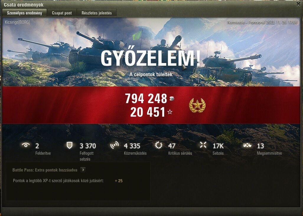 Egyetlen egy lövést sem adtam le, de a fél csapatot spotoltam és végre lőtték is. Első lettem XP-ben és nem mellesleg megvan az LT-15 küldetés. 8450 spotdamage.