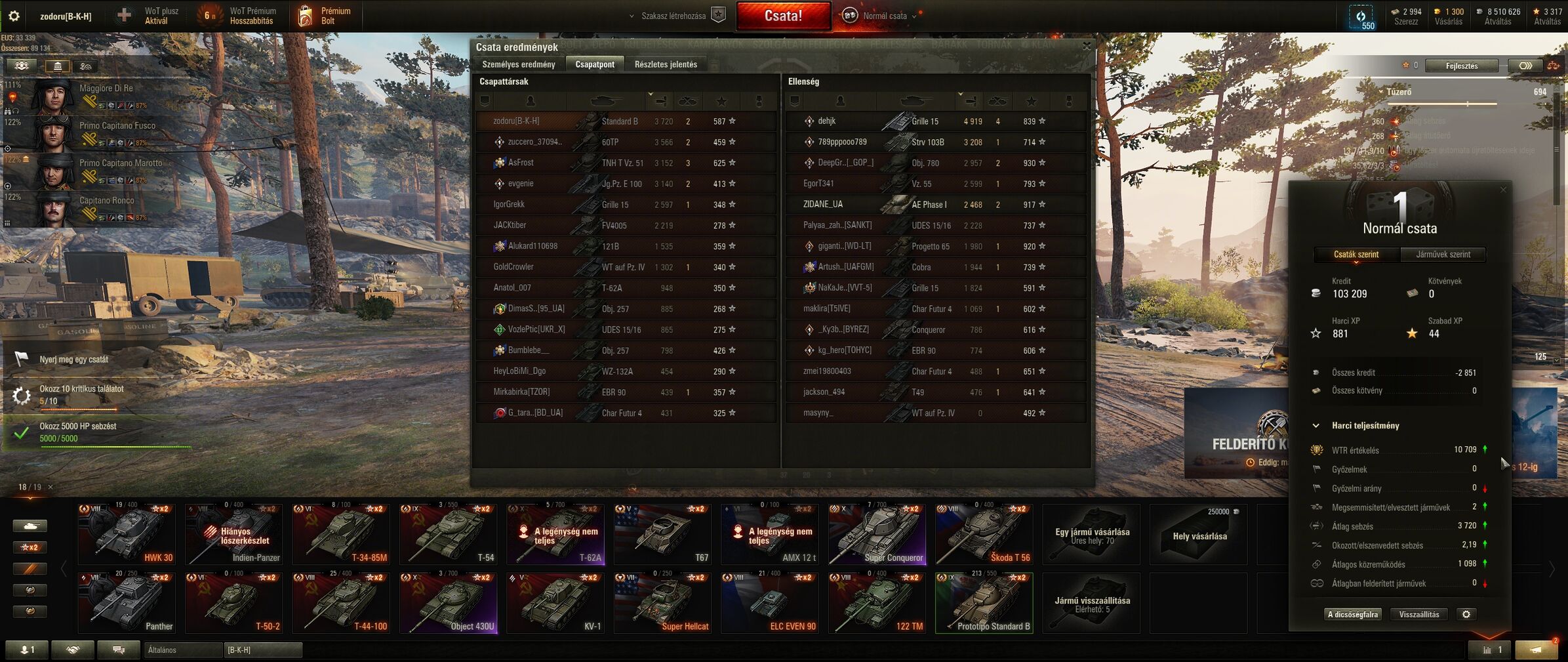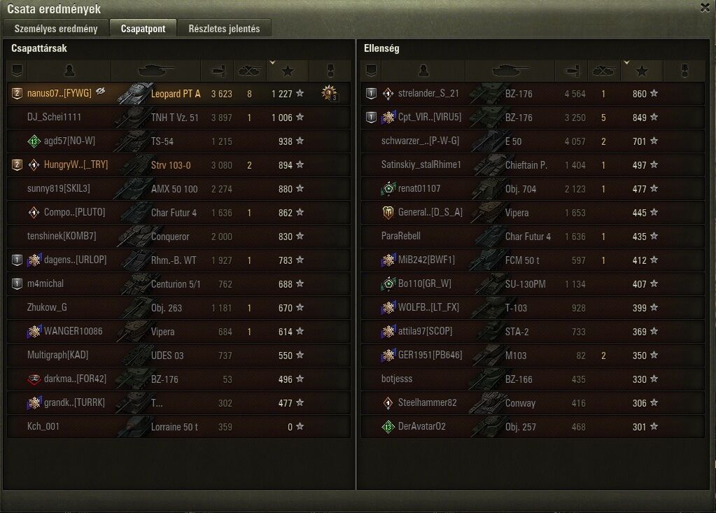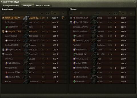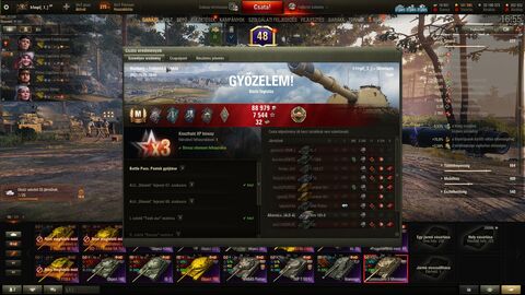 Persze, de azért a jelenlegi rendszer szerint akkor tudsz rendesen haladni, ha a győztes csatában is elől végzel és sok pontot kapsz. Abba utána több vereség is belefér, amikor tök mindegy mit csinálsz, minimum 18 pont bukta. Tegnap Maus-zal 6500 sebzéses kört sikerült bukni. Egyszerűen nem tudtam gyorsabban lőni, a csapattársak meg sorra pusztultak ki. Persze itt valószínűleg azért tudtam ennyit sebezni, mert nem engem lőtt az ellenfél. De náluk 3 Maus, 1 SC, meg 1 E100 volt, tehát már az elejétől kezdve brutális hp előnyben voltak belünk szemben. Nálunk csak 2 Maus volt. Ensk volt a pálya amúgy. Ráadásul a Mausok nagyon jól helyezkedtek és folyamatosan töltötték vissza egymás hp-ját. Ennek ellenére kicsit jobb csapattal lehozható lett volna, mert totál körbevettük őket, csak mire az ember leszedi egy E100, meg egy Maus hp-ját arra nagyon sok idő eltelik és a vasút túloldala elbukott sajnos.