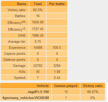 Én kilőttem már egy kb 2500 hp-s E100-at is vele egy az egy elleni harcban, igaz, hogy némi irányított szerencse is volt a dologban, mert mindig rámásztam az E100 arcára, amikor ő lőtt és én meg gyorsan tolattam és az alját lőttem, hátha kigyullad (akkor éppen nem volt hajlandó kigyulladni, de végül is mindegy volt). Ki lehet használni, hogy a torony képes pattintani a gyenge pontok ellenére is (mozgatni kell, hogy ne tudja becélozni, úgy már nehéz eltalálni, mert elég kicsi), illetve a mozgékonyságát. Mondjuk ezek nem a tipikus harci helyzetek, mert inkább messziről kell leszedni ilyenkor, ezért kell minden tankra optika vagy távcső, mert nem egy győzelem múlt már azon, hogy nekem volt és az ellenfélnek meg nem. Ebben az esetben csak mi ketten maradtunk a végére és már ott volt rajtam az E100, nem volt más választásom, mint a közelharc vele.