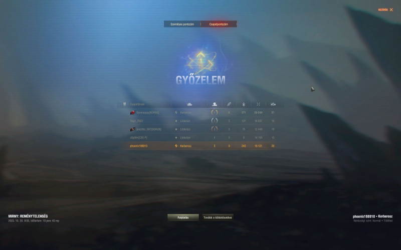 Azóta egyébként kínkeservesen sikerült 46%-ra már feltornáznom az 56TP győzelmi arányát. Egy jó győzelmi sorozat kéne hogy átforduljon 50% fölé, csak ezzel az elátkozott tankkal nagy sorozatom még csak negatívban volt.