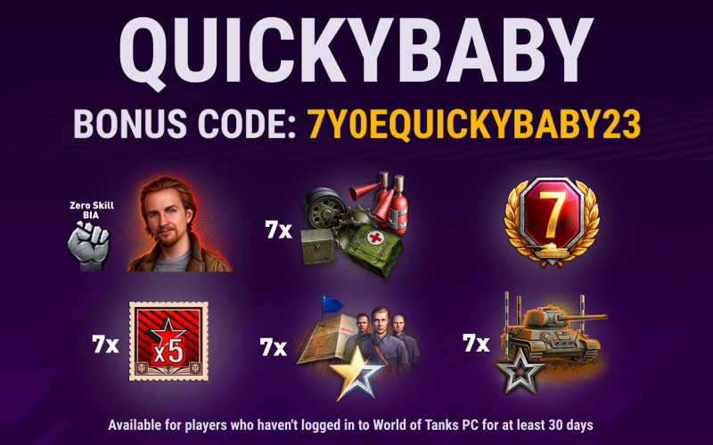 Also if you haven't played World of Tanks in 30 days you can instantly get me as a commander for free use code: 7Y0EQUICKYBABY23 or use links to redeem! EU https://eu.wargaming.net/shop/redeem/?bonus_mode=7Y0EQUICKYBABY23