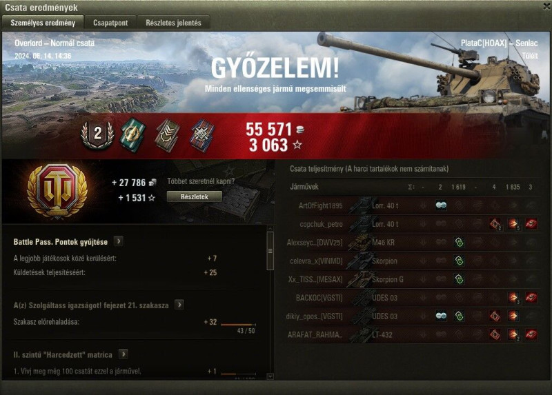Győzelem! Csata: Live Oaks Járművek: AMX 50 Foch (155) Szerzett tapasztalat: 1 953 (x2 minden nap az első csatáért) Kapott Battle Pass pontok: 35 Megszerzett kötvények: 5 Szerzett kredit: 34 083 Csatában elért kitüntetések: Tüzelj és ölj, Pascucci medál, Robbantási szakértő, Kiváló sofőr jelvény: "II. osztály" Küldetés teljesítve! Jutalom: Hozzáadva: Nagyméretű szerszám készlet (x2)