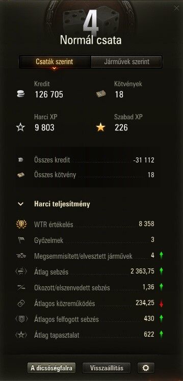 Pedig érdekelt volna az utolsó csatában egy két dolog, nem értem hogy a fenébe lőttem be alap lőszerrel E100-at beforgatva,három lövés két találat és 1500 valamennyi sebzés, na meg s conqueror-nak az elejét láttam csak a láncára tudtam lőni,mégis mind a három lövés láncolta és sebezte.