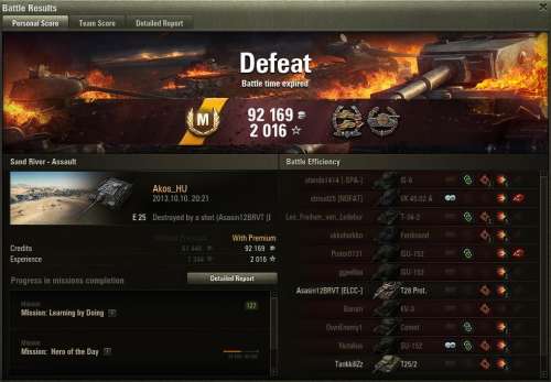 Tudod a legszebb élményem volt, mikor megvettem a JgPz E-100-at. De sajnos rémálom lett belőle. Egy ilyen TD-nek biztonságérzetet kellene nyújtania. De nem. Minden egyes elkezdett köröm vele idegeskedés, hogy mit dob a random-faktor.. A múltkor 8-as tankokról pattogott úgy, hogy oldalba toltam őket, tiszta lövéssel. Az utolsó egy Foch volt ami egy dombon tolatott felfelé. A tetejét pontosan be tudtam lőni, de semmi. Valami kritikus sérülést okoztam neki, páncélátütéssel. 5 lövés, 5 találat 0 sebzéssel. Utána bementem a rét közepére, hogy megdögöljek. Néha biztos röhögnek rajtam, mikor az első pár lövés után látom hogy szoppancson vagyok, és HE-t töltök. Aztán sebzek átlag 200-at lövésenként mint a Jagdpantherrel, csak ez 24 mp alatt tölt be. A rekordom -124HP, jó mert legalább a Mercedesem W számával egyezik, ez vigasztal.