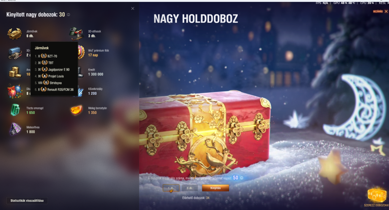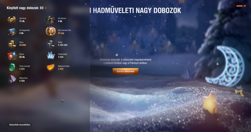 Én eddig a 80 ládából 20 (5-5) nyitottam csak ki, - mert a többit este a kislányommal majd - és eddig a 4 db 3D skinen kívül (Char Futur, BZ-75, Rhm.Pzw, Vz.55) 2db kis tankot (Cromwell és a Rhm.Beigli) adott csak, semmi nagy tank. Ebből nekem ezek alapján szerintem max egy nagy tank lesz, szerencsések voltatok, hogy 2-3-4 is pottyant Nektek. Grat mindenkinek.