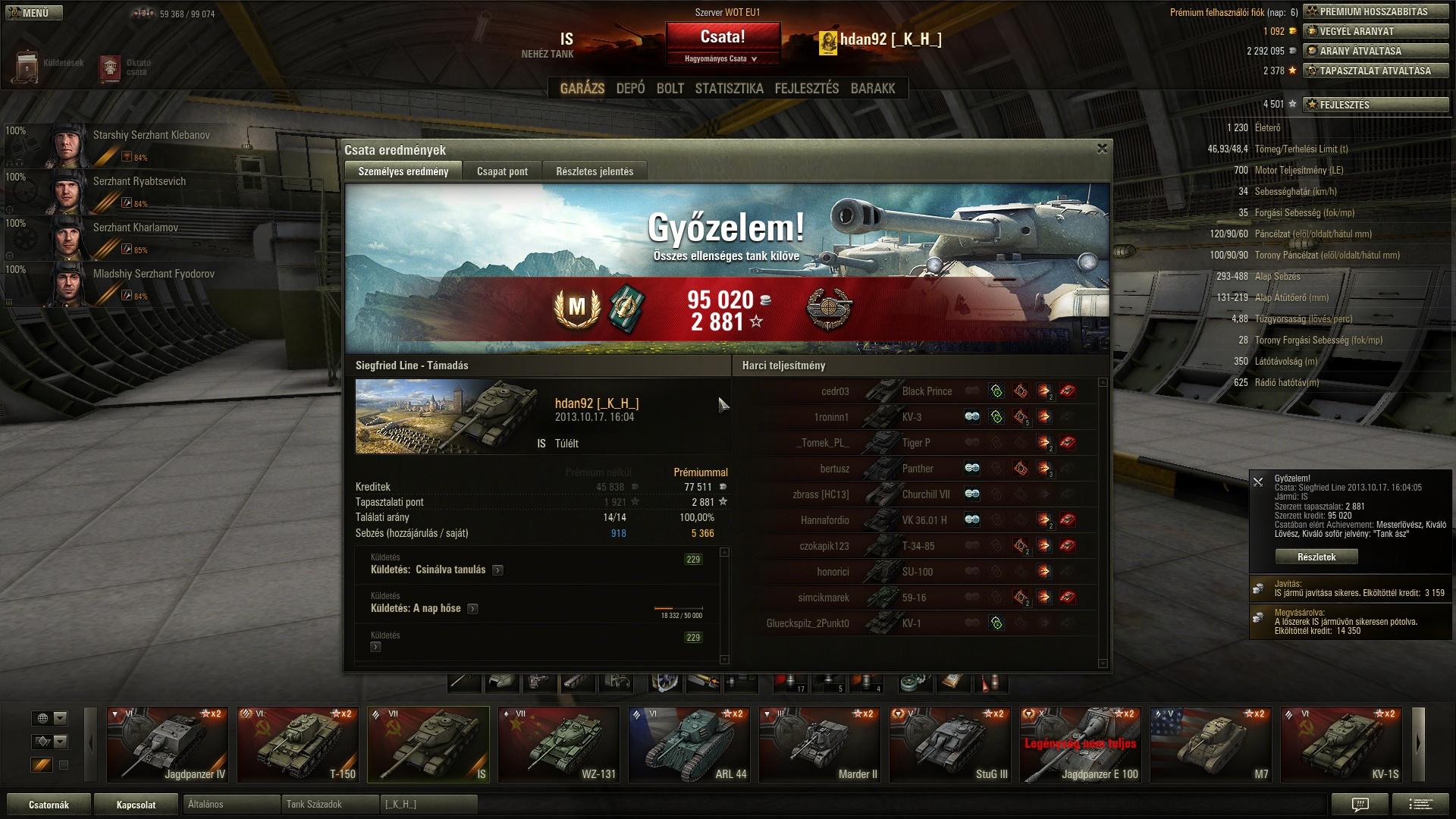 Valaki pár napja belinkelte a Huns klán tagjainak Stream linkjét. Néztem hogy játszanak a "nagyok". És láttam a xvm statjuk már nem is Zöld hanem égszinkék és van köztük lila is. Azt hiszem égszinkék 60 és 70 százalék közt. És láttam milyen piros csapatok ellen dobta be őket a gép. Hát így tényleg nem nehéz, persze elismerem tudnak is játszani. [link] 3-4 meccsüket néztem Tier 8 tankokkal mentek, IS3 és T-32, minden mecsükön totál pirosak ellen voltak, számomra már cikinek tünt ez a leosztás MM.