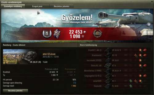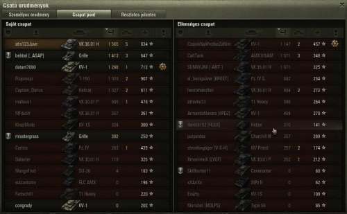 Jó régen írtam ide, de ez a jelenet annyira tetszett, hogy csak megosztom veletek. Airfielden T54-gyel kilőttem egy magyar IS7et (és az ST1 szakasztársát, szintén magyar), majd az IS7 közölte, hogy prémium lőszer, és reméli, hogy veszteséges lesz a kör. Mikor kérdeztem, hogy kell -e neki replay, azt mondta, hogy nem, mert tudja, hogy csak azzal tudtam átlőni, mert 210 pen-nel nem lehet átlőni egy is7et szemből. Mondjuk azt elfelejtette, hogy fentről lőttem, szóval a szög elég jó volt. Gondoltam csak kérek egy ts-t, hogy feltölthessem neki a replayt, de letiltott. Úgyhogy most ide belinkelem, hátha olvassa a topikot és magára ismer. Amúgy nem volt nagy kör, de itt a bizonyíték, hogy bár volt nálam gold ammo, nem használtam. [link]
