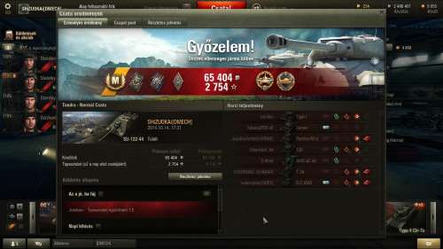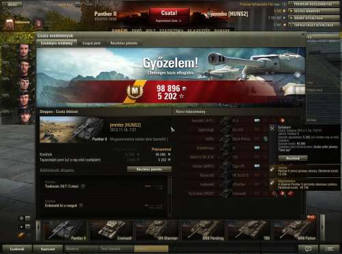 Szerény M8A1-gyel nyomtam is egyet gyorsan, de most vissza az íróasztalhoz meg a tanulnivalókhoz... :-)(Szeptemberben kezdtem csak játszani, semmi prém, csak a szimpla acc sima tankfejlesztéssel. Király játék az az igazság. :-) Itteni nickem a játékbeli is, lehet szörnyülködni a számaimon, igazi "tomato" vagyok. :-))) Mondjuk "exponenciálisan" ívelnek felfelé a mutatóim, az utóbbi két hetet tekintve már 700 felett a wn8 :-))), ami az itteniekhez képest persze szörnyű, de remélem, sikerül feljebb tornászni (~1500 csatám van csak össz-vissz). 5-ös tiernél tartok, KV1 felettébb tetszik, meg persze az M8A1, igaz az 4-es.)