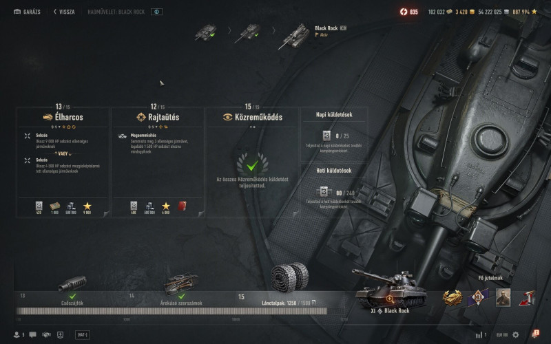 Két küldetéssel nem tudok igazán mit kezdeni, az összes többire van tankom. A top dmg meg a 4 frag, ezek vagy összejönnek vagy nem. Illetve a top dmg-re van már megoldásom, csak sz.r velük a játék, de ha muszáj, akkor ott a b2, ami mindig top tier és nem függ az mm-től így, csak drágák a körök