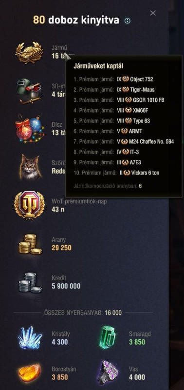 Ez biztos vigasztalja azokat akik lemaradtak a számozott DVB-152-ről. Én 18:01:10-kor nyomtam először a vásárlásra, és kaptam az első "Hiba a nyersanyagok elköltése során. Kérjük, próbáld újra." üzenetet. Akkor még legalább 15000+ darab volt. Most 0.Amúgy csak kíváncsiságból beléptem a lányom profiljával, ami már jó rég volt használva, kapott is egy csomó ajándék tankot, de a kredit itt sem jó. Neki más nincs, csak 5M+ kredit, de ő sem tud lőszert venni és nem is szinkronizálódik semmi. Pedig nem lett még a vásárlásra sem nyomva. Ezek után azért technikailag érdekelne, hogy akik meg tudták venni, nekik milyen profil specializációjuk lehet, mert csak elfogyott valahogy 50.000 tétel 2 óra alatt. Nekem 6+ kombinációban legalább 10+ próbálkozással sem sikerült, pedig volt rá kb. két órám.