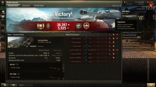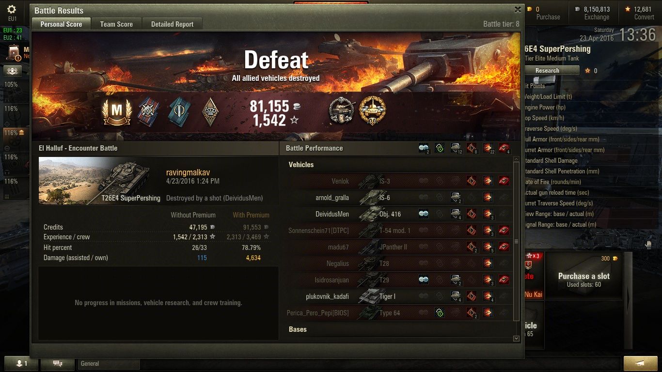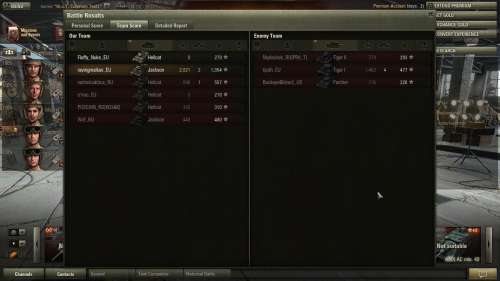 Tegyunk hozza megvalamit. Mivel ebben a jatekban nincsenek +2+3 unique varazstargyak meg tarsaik itt mindenkinek ugyanannyi eselye van kiloni a masikat. Jahat ha valalaki 8,8-al hasznalja a Tiger B-t a 10,5 helyett (vagy nonstop HE-t hasznal az IS-bol) mert az olcsobb, es meg felszerelest sem tesz ra...