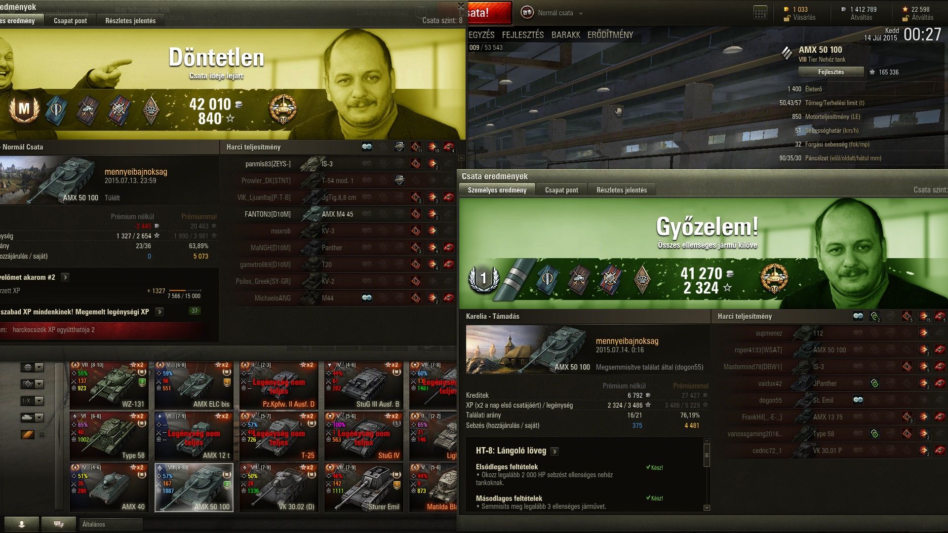 a másodikat legalább megnyertük. Replay van igény szerint.Ráadásul sikerült végre elitre fejleszteni a szörnyű Emilt. 5 csatában, 2210 átlagsebzéssel. Közel a második jel, lehet begyűjtöm mert nincs pénzem a Borsigra. Ma néztem hogy a másik accon a Bulldog 92%-on van, holnap rámegyek a 3 jelre, hátha.