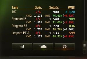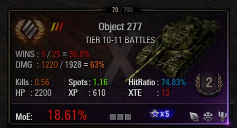 És ez a két op muszka csoda sem muzsikál jól .... , A német nehezekkel és közepesekkel fényévekkel jobb a statisztikám , pedig a legtöbb a nyomába sem érhet a két említett ruszkinak . Az obj277 az első 20 csatában 4x dobta el a tornyát ... legalább a csaták kétharmadában a láncolás után azonnal lőszerrekesz ... jó hosszú töltési idő . Ez a két tank elvan átkozva a kezem alatt . Néztem videókat , hogy a nagyok hogyan használják .... mintha nem is ugyanazzal a tankos játékkal játszanának , amivel én . A kapáslövéseket benyeli az ellen ... és majd minden lövés HP veszteséget jelent a célkeresztbe tévedt ellenfélnek . Tanácstalan vagyok , mint egy kisközség ....