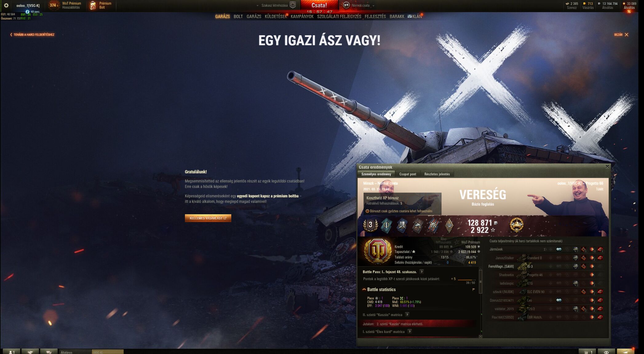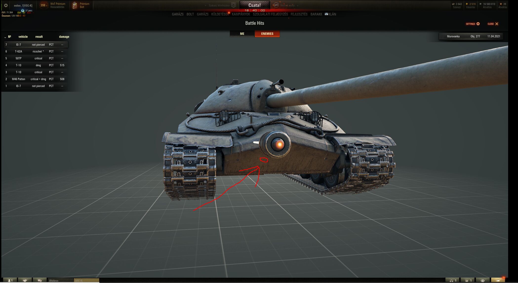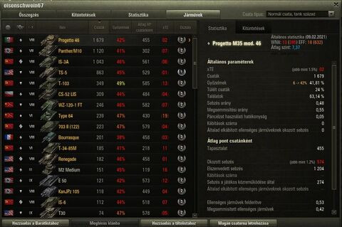 Én 4 csatát toltam a 277-el.Abból 2-szer dobta le a kupakot.Félretettem.Amúgy is nagyon gyenge vagyok vele. Progettó 65-öt viszont kedvelem.T57 Heavyvel is szeretek bohóckodni.Igazából amit én undorítónak tartok ebben a játékban az a szóráskép.Rettenet módon tudja befolyásolni a csatában elért sebzésedet.Legalábbis nemegyszer szorul ökölbe a fejem miatta.