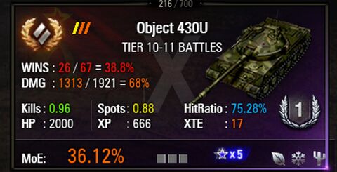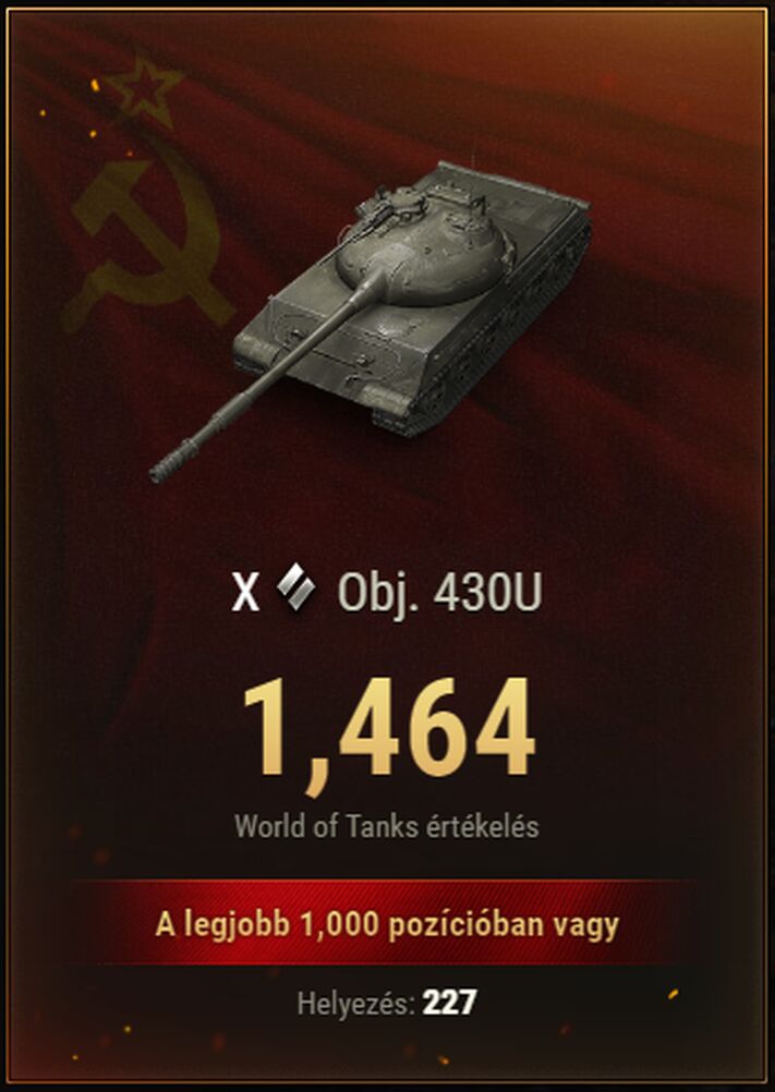Szerintem remek tank ... fürge a nehezek között ... viszonylag gyorsan tölt ... az átütése rendben lenne , ha nem pattognék a kartonpapírból hajtogatott tankok oldaláról (is) . Én ezt nem értem ... tucat - vagy annál több - csata alatt csatánként 1 , jó esetben 2 értékelhető találat . A gyatra csaták közé néha beékelődik olyan meccs , hogy nem ismerek magamra , illetve a tankra nem ismerek rá . Mindent (is) belő ... mindenki pattan... azaz dolgozik a páncél és az elvárható szintet hozza a löveg is . Na... ilyenkor úgy viselkedik a tank , mint ahogyan a nagy videómegosztó oldalakon láthassa a nagyérdemű . Az obj430U ? Az én tankom furnérból van.. dönthetem a páncélt , akkor is ott lőnek be , ahol csak akarnak . A kis testvére , az obj430 valahogyan jobban adja ... az sem az igazi , de azért na....