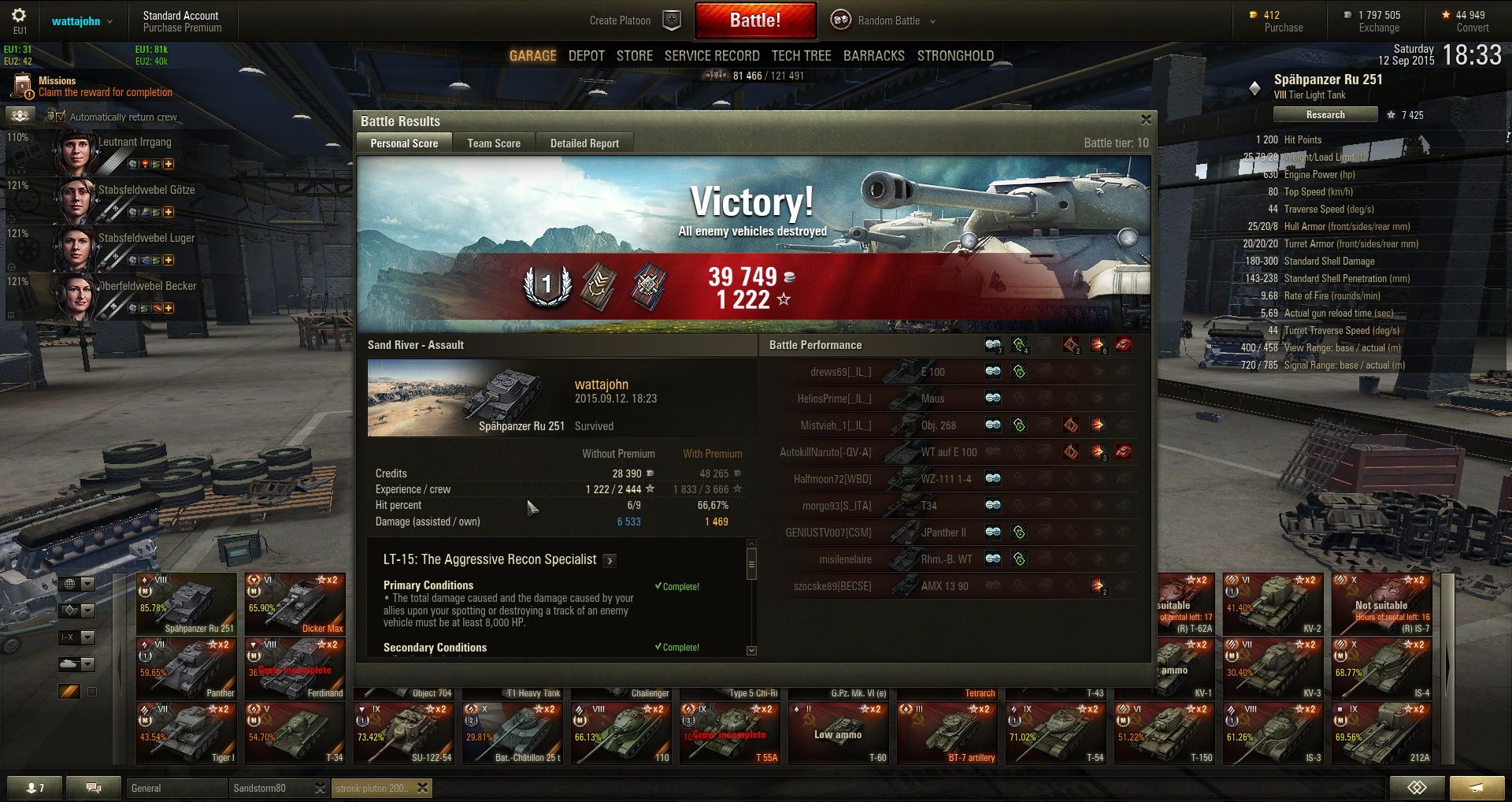 Nagyon durva amúgy ez a T10. El van indítva a T55a HT15 12k sebzés, pattintott+ benyelt sebzésre, mert nem vettem még ki a csajt, de a másodlagos nem volt meg. Ruinbergen mókázok, nyomom a dmg-et, és a végén írja hogy megcsináltam vele a küldit, mert nyertünk is. 7.1kdmg, 3k pattintott, meg majdnem elfogyott a hp is. Eszembe se jutott volna ezzel a tankkal megpróbálni a küldit.