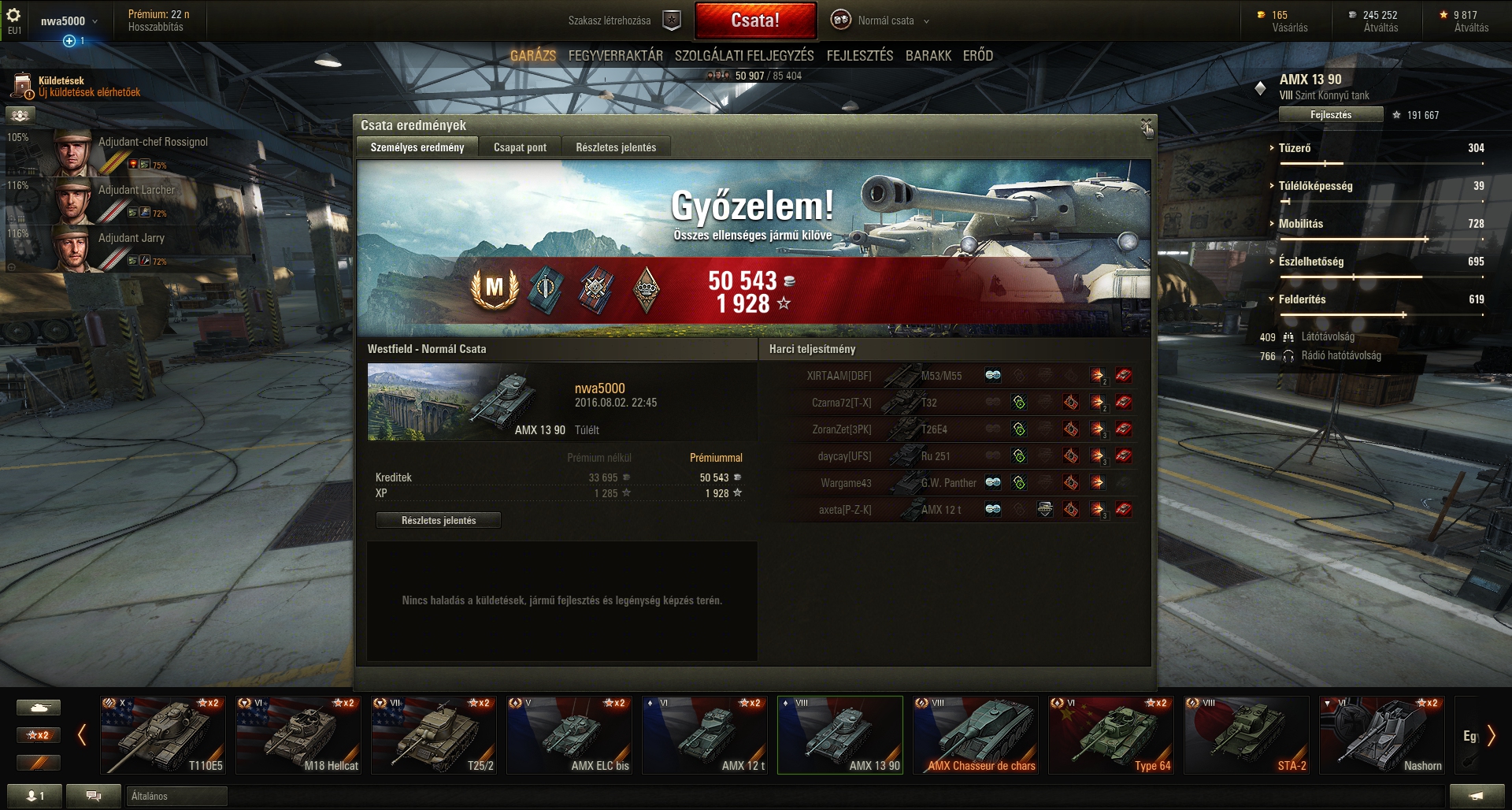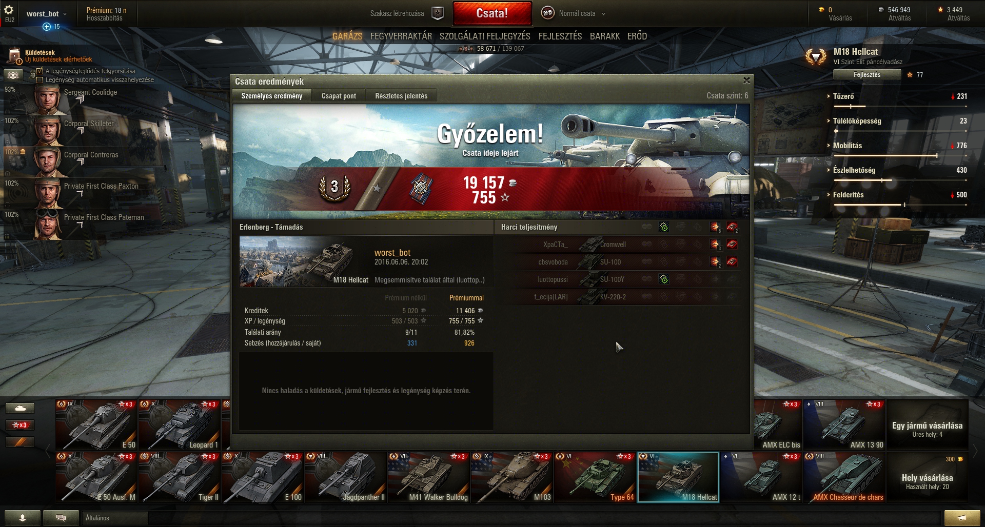 T49 szemből kicsontoz, a T-54 light is arannyal. Megy is vissza a garagéba. Hátha a nyári rebalance kicsit erősebbé teszi a heavy-kat, mert az vicc, hogy ezeket a vasdarabokat minden viszi szemből.