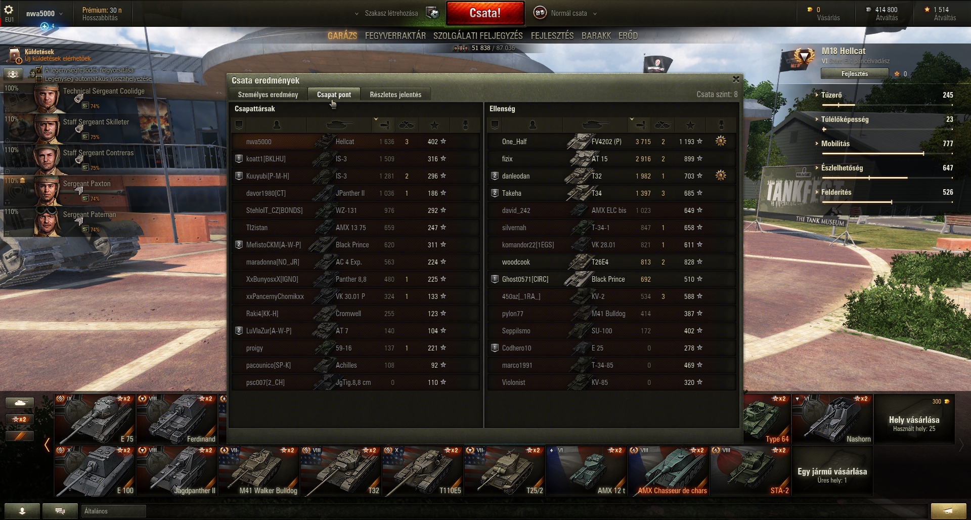 Tegnap délután a kis hellcat-tel 84.5%-on áltam. Mondom is magamnak, hogy "Laci, ha kicsit odafigyelek, 1-2 csata és megvan a 2. kiválóság jel a tank csövére". Az első tankom lett volna, amire felkerült volna...volna...volna.