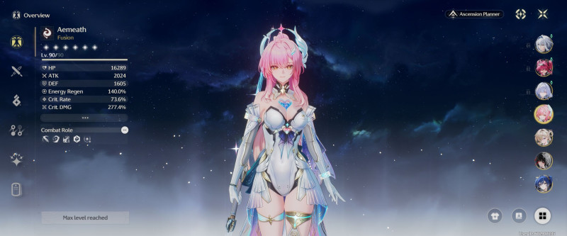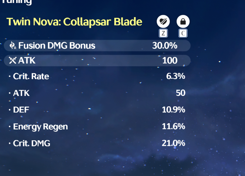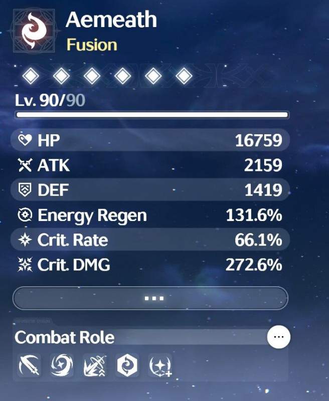 Nálam kicsit több energy regen van mert ugye Emerald of Genesist használok tehát az megspórol nekem 1 energy rollt az Echon. 'Lehet ki sem szedem a signature fegyvert, ez sem sokkal gyengébb és így kényelmesebb is használni talán'Crit % kicsit több is van mint kéne mert én ugye Shorekeeper+Lynae-vel használom mert Mornye-t skippelnem kellett.
