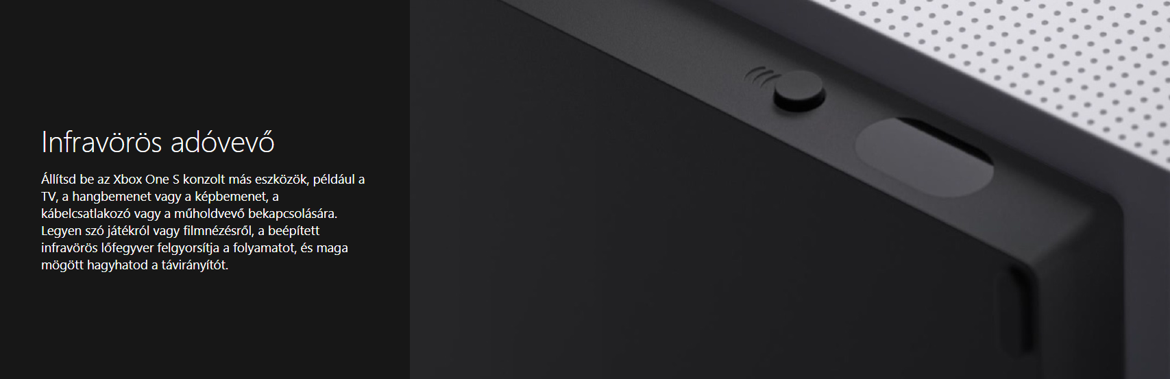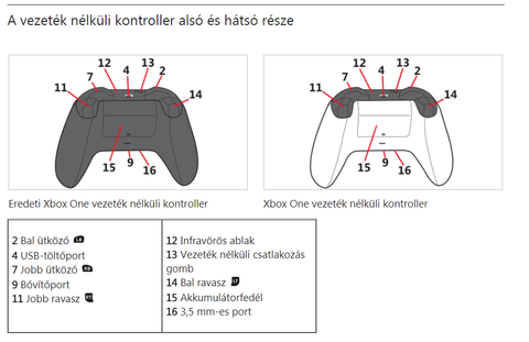 " Infravörös (IR) ablak (12): Az USB-port melletti füstszínű műanyag mögé rejtett infravörös LED-ek a kontroller és a felhasználók Kinect érzékelőn keresztüli automatikus párosítására szolgálnak. A funkcióval kapcsolatos további információért tekintse át a Fiók hozzárendelése az Xbox One vezeték nélküli kontrollerhez című témakört. "