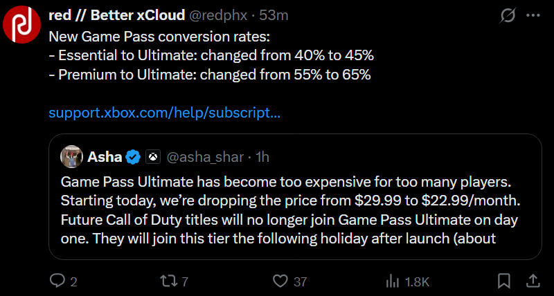 Game Pass Ultimate has become too expensive for too many players. Starting today, we’re dropping the price from $29.99 to $22.99/month.