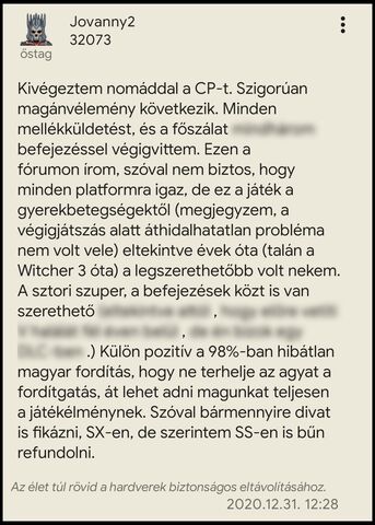 befejezéssel végigvittem. Ezen a fórumon írom, szóval nem biztos, hogy minden platformra igaz, de ez a játék a gyerekbetegségektől (megjegyzem, a végigjátszás alatt áthidalhatatlan probléma nem volt vele) eltekintve évek óta (talán a Witcher 3 óta) a legszerethetőbb volt nekem. A sztori szuper, a befejezések közt is van szerethetőmindhárom ,(eltekintve attól hogy előre vetíti V ,halálát fél éven belül .) Külön pozitív a 98%-ban hibátlan magyar fordítás, hogy ne terhelje az agyat a fordítgatás, át lehet adni magunkat teljesen a játékélménynek. Szóval bármennyire divat is fikázni, SX-en, de szerintem SS-en is bűn refundolni.de én bízok egy DLC-ben -
