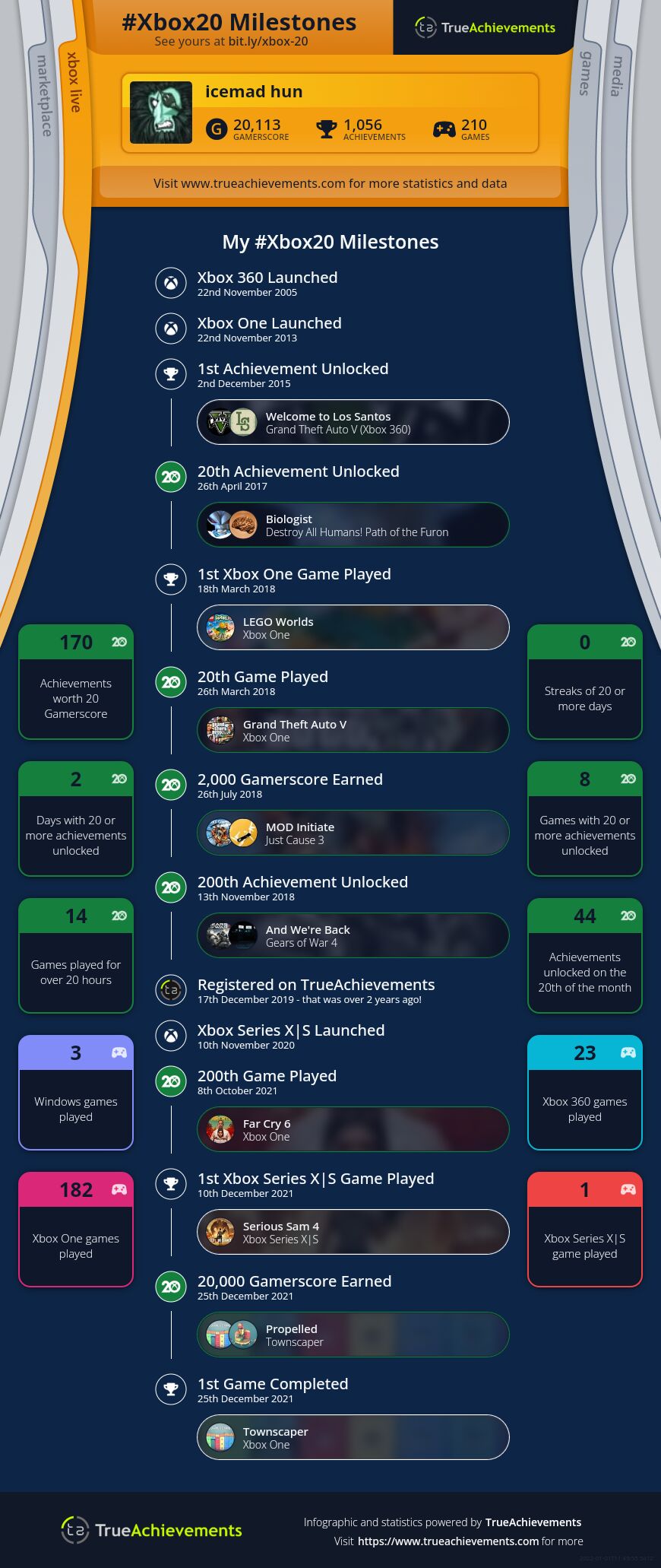 Én is megcsináltam, de nálam ez is hibás. Ugyanúgy, mint switchen az ottani statisztika. Pl nálam a 200. játszott játék a Far Cry 6, xbox one-on, holott azt csak Series x-re telepítettem és játszottam. Az első játék, amit series x-en indítottam el az oldal szerint, az meg a Serious Sam 4 volt. Ez megint csak nem igaz. Érdekességnek jó lenne, ha nagyjából pontos lenne.