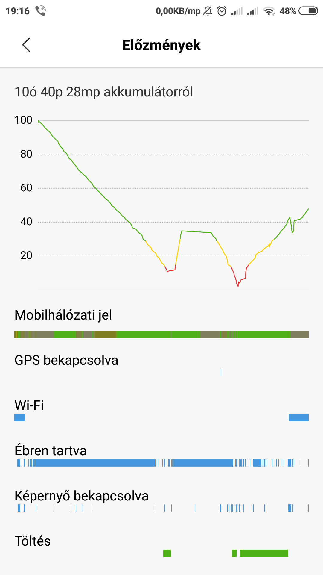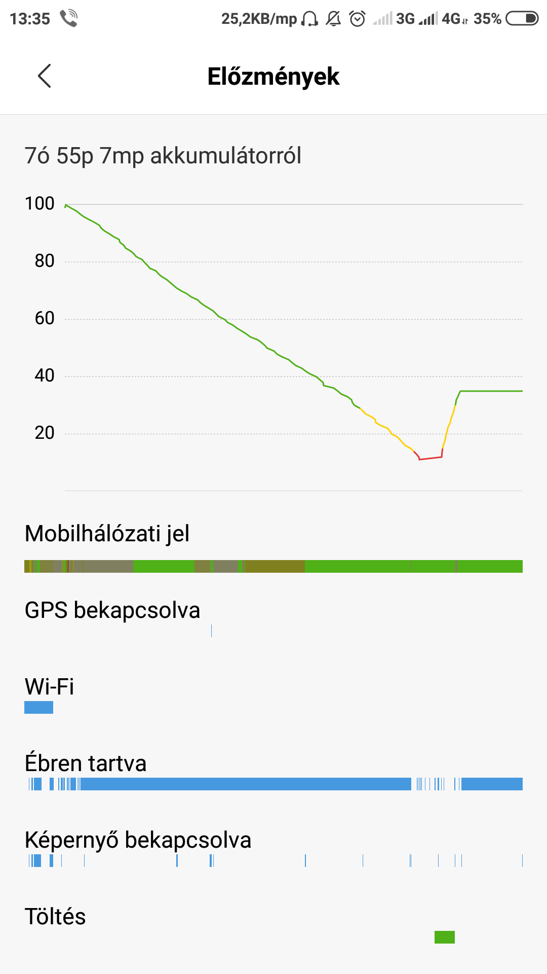 Itt látszik, amikor délben pár perc töltéssel kb.10%-ról felugrott a töltöttség közel 40%-ra, a netrádiót tovább hallgatva viszont az addigi merülés nem tapasztalható, 2 óra alatt alig merült a grafikon szerint, majd hirtelen azonnal kikapcsolásig.Itt elkezdtem tölteni, szépen emelkedett is a töltöttség, viszont az alsó sávban a zöld vonal megszakad a vége felé, mintha a töltés megállt volna, de közben töltőn volt a töltöttség emelkedéséből ez látható.