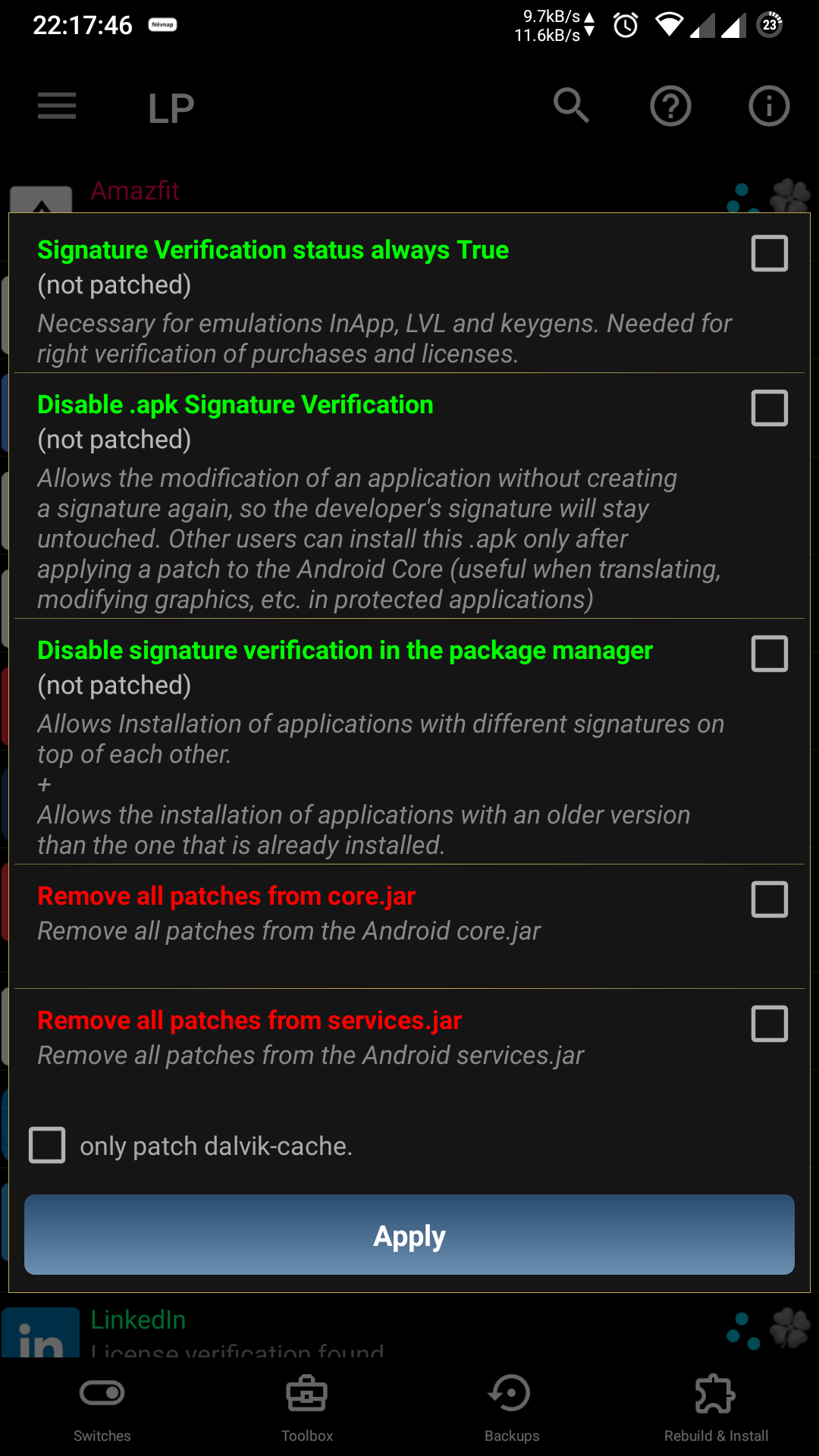 A Vanced managerrel csináltam és ott volt a root-os megoldásnál írva hogy kell hozzá lucky patcher de így jobban átnézve a linkeket valószínű hogy valamelyik "kamu" leírást követtem hiába tűnt eredetinek az oldal, amit most nem találok de lehet az otthoni gépemben meglesz