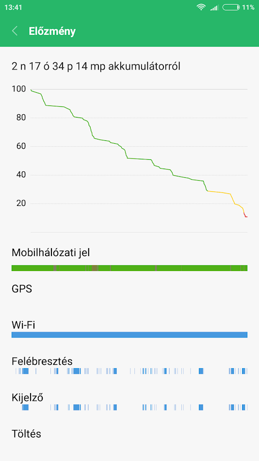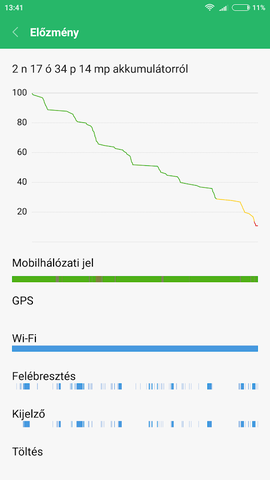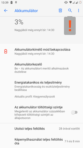 A maradék pedig telefonálás, discord chat, pár fotó. Játék nem volt. Végig net eléréssel (wifi vagy 4g). Stabil, gyors rom. A teljesítmény végig kiegyensúlyozott módban volt, csak az utolsó 2%-nál raktam át takarékosba.