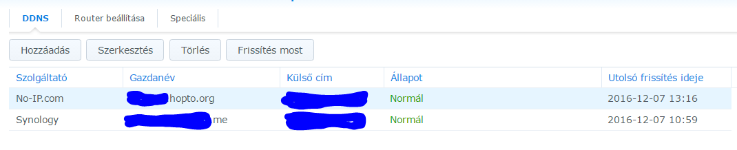 Akkor ott kaptál egy címet amihez az ip-d lesz rendelve. Nem néztem neked 5-vagy 6 van e dsm-ből, 5 alatt tuti hogy vezérlőpult/külső hozzáférés után hozzáad gomb, és értelem szerűen ki kell tölteni. Szolgáltató no-ip.com gazdanév amit regisztráltál akármi.ddns.net vagy akármi amit belőttél, felhasználónév a noip-s login user, hozzá tartozó jelszó és ennyi.