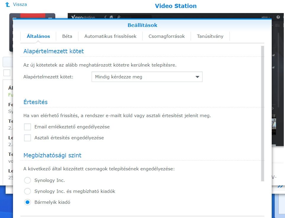 Tvheadend, használatához a Video Station-t telepíteni kell, annak érdekében, hogy a tunert lássa az eszköz.