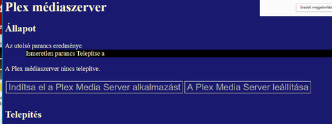 Szerverbeállításoknál teker egy ideig, majd nem túl bőbeszédűen közli, hogy "Hiba lépett fel a Plex Média Szerver alapvető fontosságú részén".