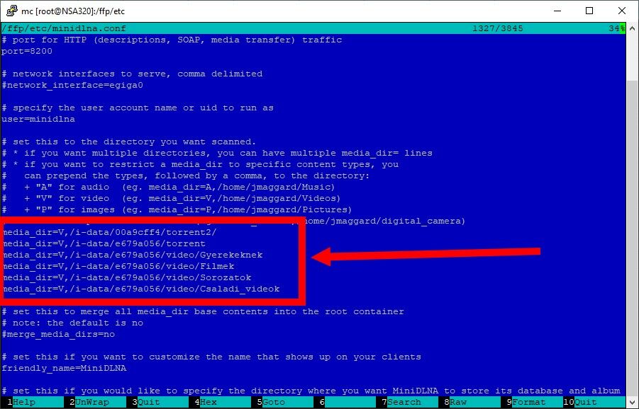 Itt az én DLNA kiszolgálóm konfigja. Bekeretezett részben látod, hogy én csak ezeket a könyvtárakat (és nyilván az ezekben lévő alkönyvtárakat) publikálom a DLNA-n. Ezen kívül kismillió más is van a nason, de csak ezeket teszem ki dlna-ra. Amint látod van két torrentem is (torrent és torrent2 néven két külön hdd-n).