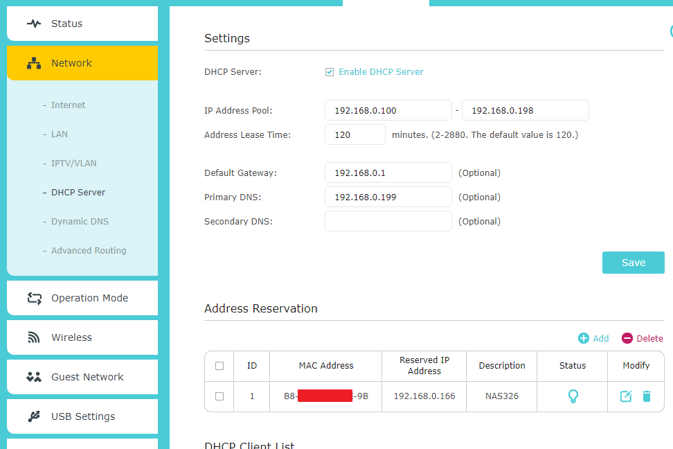 NAS-ban manuálisan van IP beállítva, routerben pedig ez az IP le van foglalva a NAS-nak, azaz fix.